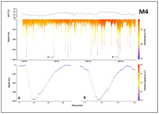 Dive profile of reef manta rays (Mobula alfredi) recorded using pop-up satellite tags (SPLASH10 and MiniPAT) in New Caledonia. SST indicates Sea Surface Temperature. A and B are the deepest dives.