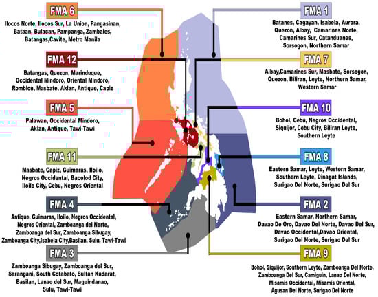 In managing and administering its fisheries resources and activities, the Philippines has divided its surrounding waters and seas into 12 fisheries management areas (FMAs), as shown in Figure 1 []. The FMAs are color-coded to show their respective areas of coverage or regions comprising the FMAs, while the land features are depicted in white colors. FMA 1 is shown in light purple color; FMA 2 is shown in dark purple color; FMA 3 is shown in dark grey color; FMA 4 is in blue-grey color; FMA 5 is in red-orange color; FMA 6 is in orange color; FMA 7 is in light yellow color; FMA 8 is in blue color; FMA 9 is in yellow-green color; FMA 10 is in violet color; FMA 11 is in light green color; and FMA 12 is shown in red color.