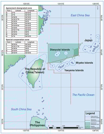 The Taiwan–Japan Fisheries Agreement is unique in its own right. It provides the basis for being able to find a common ground for cooperation without necessarily touching on sensitive issues such as territorial or boundary disputes. The Taiwan–Japan Fisheries Agreement provides for specific areas, shown in Figure 4, wherein fishing vessels from both countries may fish without interference from their counterpart law enforcement agencies []. There is a zone as defined by the agreement, which comprises the waters where the laws of both parties are not applicable, and also the “special cooperation zone”. In these areas, Japan and Taiwan previously asserted the use of the “median line” or “TEL”. Through the agreement, the portions of the waters as approved by both parties are now delineated by geographical coordinates [].