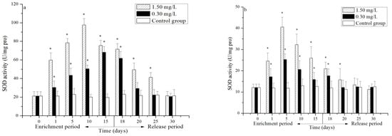 During the enrichment stage, the SOD activity in the hepatopancreas and gill of the 1.50 and 0.30 mg/L test groups was significantly induced at the first day (p < 0.05). The SOD activity in the hepatopancreas of the 1.50 mg/L test group continued to increase and then decreased, reaching the peak at the 10th day; the activity of this group was 4.89 times higher than that of the control group. The SOD activity in the hepatopancreas of the 0.30 mg/L test group continued to increase and reached the peak at the 15th day; the activity of this group was 3.48 times higher than that of the control group (Figure 1a). The SOD activity in the gill of the 1.50 and 0.30 mg/L test groups increased initially and then decreased, reaching the peak at the fifth day; the SOD activity of this group was 3.43 and 2.14 times higher than that of the control group (Figure 1b). During the entire enrichment stage, the SOD activities in both the hepatopancreas and gill of the 1.50 mg/L test group were higher than in the 0.30 mg/L test group. In the release stage, the SOD activity in the hepatopancreas of the 1.50 and 0.30 mg/L test groups decreased continuously. The 1.50 mg/L group recovered to the normal level at the 30th day (p > 0.05), whereas the 0.30 mg/L group recovered at the 25th day (p > 0.05) (Figure 1a). The SOD activities in the gill of the 1.50 and 0.30 mg/L test groups recovered to the normal level at the 25th day (p > 0.05) and 20th day (p > 0.05), respectively (Figure 1b).