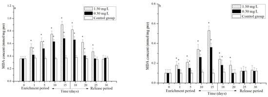 During the enrichment stage, the MDA content in the hepatopancreas and gill of the 1.50 and 0.30 mg/L test groups increased significantly at the first day (p < 0.05). The content continued to increase and reached the peak at the 15th day. The highest MDA contents in the hepatopancreas of the 1.50 and 0.30 mg/L test groups were 2.42 and 1.83 times higher than in the control group (Figure 2a), respectively, whereas the highest MDA contents in the gill were 5.54 and 3.76 times higher, respectively (Figure 2b). In the entire enrichment stage, the MDA contents in the hepatopancreas and gill of the 1.50 mg/L test group were higher than those of the 0.30 mg/L test group. In the release period, the MDA contents in the hepatopancreas and gill of the 1.50 and 0.30 mg/L test groups declined continuously. The MDA content in the hepatopancreas of the 1.50 mg/L test group recovered to the normal level at the 30th day (p > 0.05), and that of the 0.30 mg/L test group recovered at the 25th day (p > 0.05) (Figure 2a). The MDA content in the gill of the 1.50 mg/L test group recovered to the normal level at the 25th day (p > 0.05), and that of the 0.30 mg/L test group recovered at the 20th day (p > 0.05) (Figure 2b).