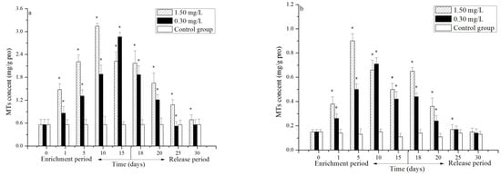 During the enrichment stage, the MT content in the hepatopancreas and gill of the 1.50 and 0.30 mg/L test groups increased significantly at the first day (p < 0.05). The MT content in the hepatopancreas of the 1.50 mg/L test group continued to increase and then decreased, reaching the peak at the 10th day; the MT content of this group was 5.58 times higher than that of the control group. The MT content in the hepatopancreas of the 0.30 mg/L test group continued to increase and reached the peak at the 15th day; the MT content of the test group was 5.09 times higher than that of the control group (Figure 3a). The MT content in the gill of both test groups increased initially and then decreased, reaching the peak at the 5th and 10th days. The highest MT contents in the gill of the 1.5 and 0.30 mg/L test groups were 6.93 and 4.76 times higher than in the control group. At the 15th day, the MT content in the gill of both test groups was still far higher than that of the control group (p < 0.05) (Figure 3b). In the release stage, the MT content in the hepatopancreas of the 1.50 mg/L and 0.30 mg/L test groups reduced continuously. The MT content in the hepatopancreas of the 1.50 mg/L test group was significantly higher than that of the control group at the 30th day (p < 0.05), and the MT content in the gill of the 0.30 mg/L test group recovered to the normal level at the 25th day (p > 0.05) (Figure 3a). The MT content in the gill of two test groups increased slightly, decreased continuously, and then recovered to the normal level at the 30th day (p < 0.05) (Figure 3b).