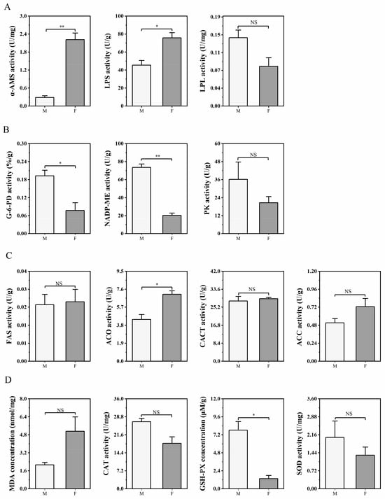 Comparative assessment of liver enzyme activities related to (A) digestion, (B) energy metabolism, (C) lipid metabolism, and (D) antioxidant defense in male and female yellowfin tuna. Error lines indicate SEM (n = 3). Asterisks indicate significant differences between the two groups (* p < 0.05, ** p < 0.01). NS: not significant (p > 0.05).