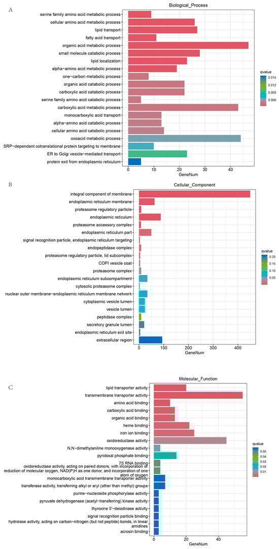 Functional categorization of differentially expressed genes in liver GO enrichment. (A) Biological process, (B) molecular function, and (C) cellular component.