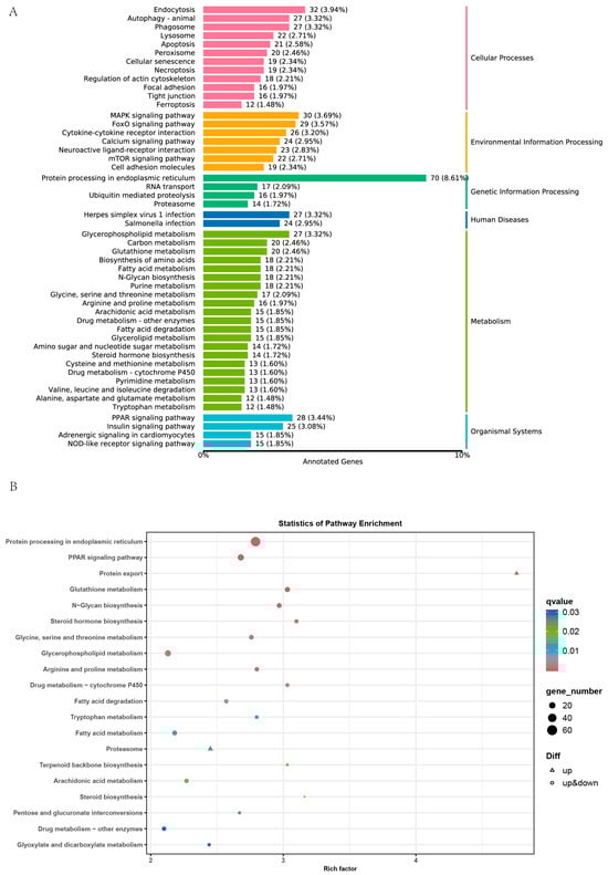 (A) KEGG categorization diagram of differentially expressed genes, with metabolic pathway names on the vertical axis, pathway names on the left, and corresponding categorization categories on the right. Colors in the same column indicate the same category. (B) Scatter plot of KEGG pathway enrichment for differentially expressed genes, with the pathway names on the vertical axis, enrichment factor on the horizontal axis, color representing the q value (p-value corrected by multiple hypothesis testing), and circle size indicating the number of enriched genes in the pathway. In the gene expression pathways context, ‘up’ signifies that all genes in the pathway are up-regulated, while ‘up&down’ indicates a mix of up-regulated and down-regulated genes.