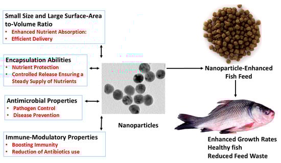 The large surface area-to-volume ratio of these NPs also enables the efficient loading and encapsulation of essential nutrients and therapeutic agents. This capability helps protect these components from degradation and ensures their controlled release. Encapsulation not only enhances the stability of nutrients and therapeutic agents but also enhances their absorption by fish. As a result, this leads to improved feed conversion ratios, better growth performance, and overall enhanced health outcomes in aquaculture. Additionally, the targeted delivery of these nutrients can help in minimizing waste [,,].