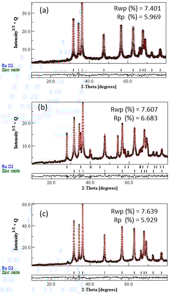 The variation in the lattice parameters, calculated using MAUD software, is represented by a comparison histogram in Figure 3 for set A and set B Zn1−xRuxO nanoparticles. The lattice parameters reduce its value as the heating temperature increases in set B, similar to the findings reported by Kayani et al. [33] while studying the effect of calcination temperature on ZnO nanoparticles. As ruthenium doping increases, the lattice parameters increase, confirming the increase in crystallite size shown in Table 1. Such trends are attributed to the increase in surface dangling bonds that tend to increase the bond length (L). Obviously, lattice parameters (a) and (c) showed an increasing tendency with the volume fraction (V) and bond length (L) with the reduction in the crystallite size as Ru doping increases, as shown in Table 1. This may be due to a change in cation–anion attraction forces as Ru3+ ions are integrated into the Zn2+ interstitial position, leading to a change in the samples’ electronegativity [34].
