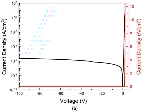 The I–V curves of the p+-NiO/n-Ga2O3 heterojunction, presented in Figure 2a,b, were measured using a Keithley 2400 Source Meter. The measurements were carried out at room temperature. The same instrument was employed to drive a forward current of 100 μA through the structure in Figure 1 for the total duration of 900 s, corresponding to the maximum charge of 90 mC. The forward current resulted in hole injection from p-niO to n-Ga2O3 layers and led to the results presented in the following section of this paper.
