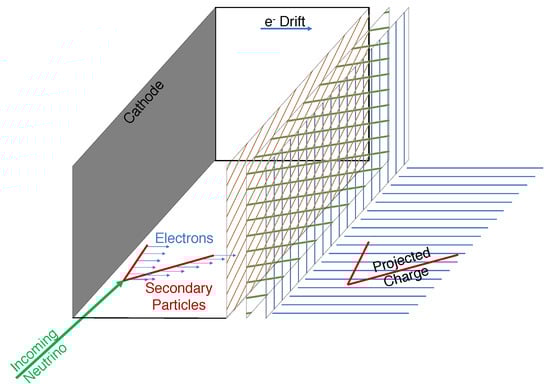 LArTPC detectors are at the forefront of experimental neutrino research, building larger and larger experiments, such as the Short Baseline Neutrino Program at Fermilab [], the ProtoDUNE experiments at CERN [], and eventually, the Deep Underground Neutrino Experiment (DUNE) [,,]. The operational principle of a LArTPC detector is illustrated in Figure 1. In LArTPC detectors, charged particles traversing the volume filled with liquid argon release trails of ionization electrons, which are transported to one side of the detector thanks to an electric field. Here, the electrons are read out thanks to a series of sense wires. There are usually two or more planes of sense wires and the electrons induce a signal on the first planes (orange and green in the picture) and are collected on the last plane (blue) where electric field lines terminate. The result is a collection of waveforms from every single wire. The amplitude of such waveforms depends on the amount of detected electron charge, which changes as some particles are more ionizing than others. Placing all the waveforms next to each other gives rise to an image, and in the end, each LArTPC digitizes a collection of 2D image-like signals, across several projections of 3D space corresponding to the wire orientation on the different wire planes (in the figure, the images result in a top-down projection, and at two angles offset from vertical). The waveforms that make the images are digitized at up to 2 MHz timing resolution. The collection of projected images from the same 3D interaction is referred to as an event. In the smallest detector of those mentioned above, the images produced have a resolution of () pixels for two images at angles, and a resolution of () pixels for the vertical image.