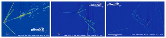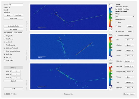 From these ideas comes TITUS: an event display to visualize neutrino interactions in time projection chambers. This display is currently in use in many neutrino experiments at the Fermi National Accelerator Laboratory: MicroBooNE, SBND, and ICARUS [,,]. Additionally, techniques developed for TITUS have been extended to visualize other neutrino experiments, including ProtoDUNE and LArIAT []. Three examples of event visualization with TITUS are shown in Figure 2.