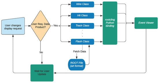 The TITUS display is designed to be fast, intuitive, and extensible. To support this, we have developed the entire interface through PyQt [,], and use the PyQtGraph [] package to efficiently render images with OpenGL. The larsoft package is exclusively C++, while we want to enable customization and extensibility through Python. To do this, we have created C++ processing kernels, along with wrappers to enable them in Python, enabling optimized data fetching with easy access to the data products in Python. For each event to be visualized, the data processing kernel is enabled by the GUI through the actions of the user: if a user selects raw images or derived products to be drawn (typically through a drop-down menu in the GUI), the appropriate kernel is added to the list of processing kernels and it’s visualization routines are called.