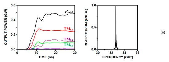 Simulations of 2D SWO based on the “Sinus-6” accelerator were carried out using PIC code CST Studio Suite. Parameters for the simulations were taken close to the experimental conditions. The results of simulations are presented in Figure 12 and demonstrate the establishment of a narrow-band oscillation regime under the design parameters. The output power reached 0.5 GW under the electron efficiency of ~25% (Figure 12a). Longitudinal and transverse structures of the various components of the RF-field inside the interaction space of the oscillator are shown in Figure 12b. Components Hφ and Ez corresponded to the interference of the axially propagating partial waves interacting with a rectilinear tubular REB, and the Hz field component corresponded to the interference of transversely (azimuthally) propagating partial wave-beams (“waves of synchronization”). Simulations demonstrated that the RF-field structure corresponded to the excitation of the fundamental mode of a 2D-periodic slow-wave structure. At the same time, the spatial distribution of the partial wave synchronous to the electron beam (emitted from the SWO) had an azimuthally symmetric structure and, when decomposed by proper waves of a cylindrical waveguide, contained the waveguide modes of the TM0,n type.