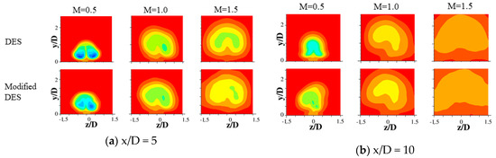 Front view of time-averaged dimensionless temperature contours at (a) x/D = 5, (b) x/D = 10, (c) x/D = 15 obtained using the DES and modified DES models.
