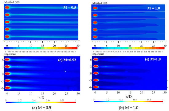 In Figure 23, the time-averaged film cooling effectiveness contours from modified DES simulations are compared with the 2D effectiveness measurements [33]. At first, similar trends could be observed in the contour for the simulation and experimental results. For M = 0.5, the modified DES results show similar film cooling effectiveness distribution before x/D = 10 compared to the measured results. After x/D = 10, the modified DES results indicated insufficient mixing of the jet and mainstream in this case. Better predictions of spanwise mixing in the downstream were observed for M = 1.0 and 1.5. For M = 1.5, the experiment shows a clear liftoff right after the hole, and the neighboring jets start to interact with each other after x/D = 10. The modified DES simulation results show similar features.