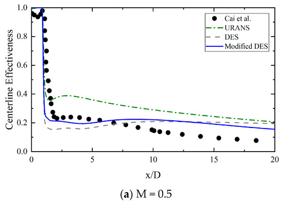 Comparison of centerline effectiveness from the URANS, DES, and modified DES models with the experimental results [33] for (a) M = 0.5, (b) M = 1.0, and (c) M = 1.5.