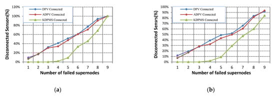 Agriculture sensors may fail for various reasons, such as energy discharge, hardware faults, and severe weather. This failure can disconnect a series of nodes from the network. It is essential to design fault-tolerant methods for network re-connectivity. In the disjoint path vector (DPV) method [6], each node is connected to a set of supernodes through k-disjoint paths to enable a node to select other paths to transmit the sensed data in case of node failure. DPV is aimed at reducing the total transmission range and maximum transmission range in order to lengthen the network’s lifetime. It can maintain supernode connectivity at a node failure rate of up to 5% [5,28]. In DPV, a node failure reduces k-vertex connectivity, whereas a supernode failure disconnects a large number of nodes. In [5], the adaptive disjoint path vector (ADPV) utilized r-restoration paths to maintain k-vertex connectivity. Despite improved supernode connectivity, it had two significant disadvantages: (1) the supernode layer was not fault-tolerant, and supernode failure disconnected a large number of nodes; (2) hotspots were required to be much more than k in number to avoid bottlenecks and premature death. In other words, ADPV was heavily dependent on the network structure and node locations in an operating environment.