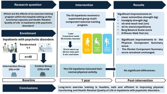 Theochari V, Mameletzi D, Teloudi A, Kaprinis S, Kouidi E. Effects of a Long-Term Exercise Training Program on the Functional Capacity and Health-Related Quality of Life in Inpatients with Psychotic Disorders: A Randomized Controlled Trial. Journal of Functional Morphology and Kinesiology. 2025; 10(4):401. https://doi.org/10.3390/jfmk10040401