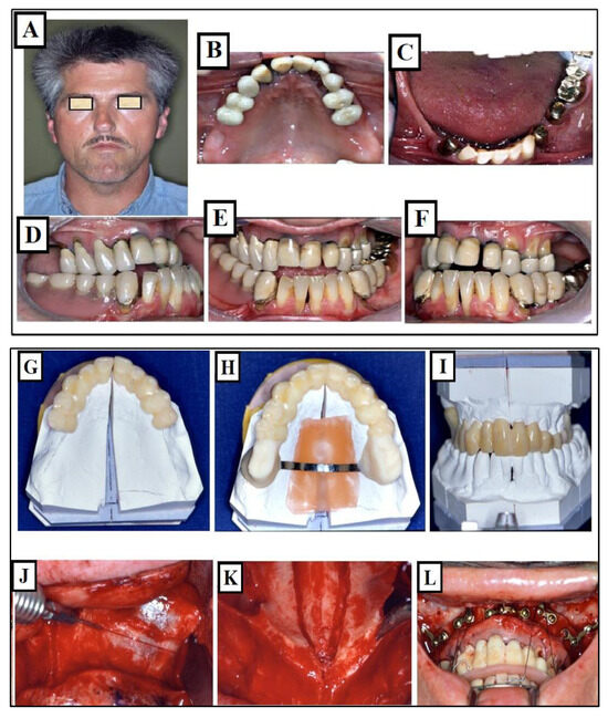 The configuration and balance of the maxillary arch, the contour of the palatal vault, occlusion, the primary respiration pattern (i.e., nasal or oral), and the width of the oral passage during grinning were all assessed for clinical purposes. A transverse insufficiency in the maxilla can be detected by hollowing out the paranasal area, widening the buccal corridors excessively, deepening the nasolabial region, or reducing the width of the alar bases (Figure 15A–L). The modest soft tissue alterations linked to sexually transmitted diseases could make diagnosis more challenging. Therefore, the primary symptoms are pronounced crowding, rotation, or buccal/palatal displacement of the teeth, lateral/medial tooth misalignment, crossbite on one or both sides, an elevated palatal vault, and occlusions exhibiting an hourglass or V-shaped pattern. One of the causes of sexually transmitted diseases is mouth breathing. As a result, in otolaryngology practice, the aforementioned findings are sometimes noticed. Patients with STDs need to be assessed for mouth breathing and referred as needed to the relevant specialty. Excessive vertical dimension of the maxilla, coupled with a mandibular prognathic relationship, Apertognathic malocclusion (skeletal and/or dentoalveolar open bite), and corrected cleft palate are examples of dentofacial malformations linked to STDs. A physician can initially diagnose transverse insufficiency using these visual cues [34,43,44]. After closure, the mandibular shift needs to be evaluated. A frontal face examination may reveal lateral chin deviation; if this is the case, the underlying cause must be found. This can be the result of real bone asymmetries or a functional movement away from centric relation. If there is any doubt about the lateral displacement, it is best to temporarily disarticulate the occlusion for a period of one to two weeks, then have another examination done. Bite plates can be used for this. Here, the patient’s compliance could be in question, especially in the case of younger children. In this situation, the occlusion can be disarticulated, and a lateral displacement can be examined by inserting and gently activating a fixed (Hyrax) expander. It is imperative to notify all relevant stakeholders, including parents and patients, that therapy perhaps not definitively initiated unless the presence or absence of a lateral shift has been confirmed. Unilateral chin and crossbite asymmetry is used to suggest real unilateral skeletal asymmetry if a lateral shift is not observed [28].