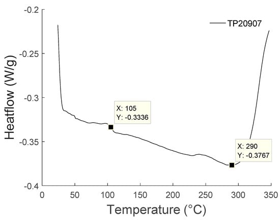 The composite thermoplastic filament was subjected to differential scanning calorimetry (DSC) (2920 Modulated DSC, TA Instruments Inc., New Castle, DE, USA), to identify the thermophysical properties of the material, such as glass transition, decomposition temperature and any other thermophysical material interactions during heating. Those properties helped to identify processing conditions such as the temperature of the build surface and extrusion. DSC was operated under an argon gas environment with a 200 mL/min−1 purging rate, at a heating rate of 10 °C·min−1 from room temperature up to 350 °C. All samples were introduced in high purity aluminium pans with an empty pan used as a reference to calibrate the baseline.