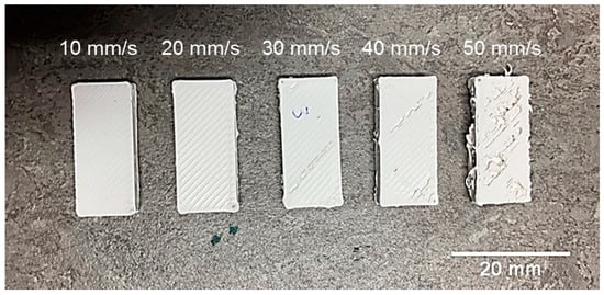 The first process parameter to be investigated was the printing speed with a range of 10–50 mm/s extrusion speeds attempted. The 10–20 mm/s speed range performed well and allowed the successful three-dimensional manufacturing of test samples without any visible defects. However, no successful builds could be achieved when a printing speed passed the 20 mm/s. Test samples printed with speeds in the range of 30–50 mm/s appeared to have several defects during the extrusion process, mainly due to the poor interlaminar bonding between layers, as shown in Figure 3. Additionally, adhesion of the first layer with the build surface appeared to be problematic and was only successful when a printing speed as low as 10 mm/s was used. Therefore, a combination of printing speeds were chosen, 10 mm/s for the bottom layer and 20 mm/s for the rest of the structure, as the most suitable settings for the successful and repeatable manufacture of the test samples in this study.
