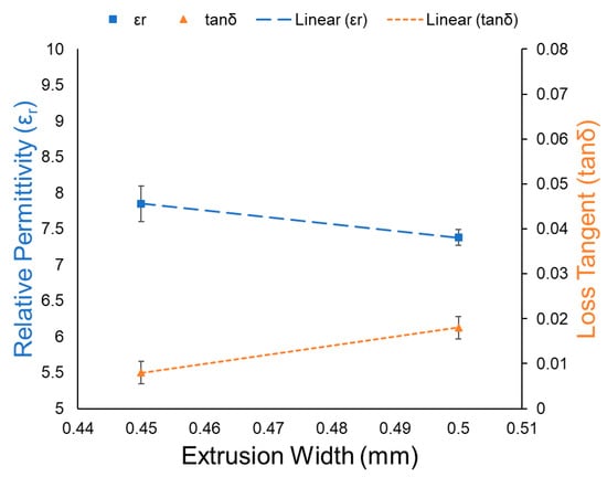 The effect of extrusion width (mm) vs. relative permittivity (εr) and loss tangent (tanδ).