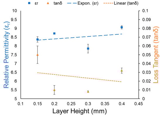 Layer height vs. relative permittivity (εr) and loss tangent (tanδ).