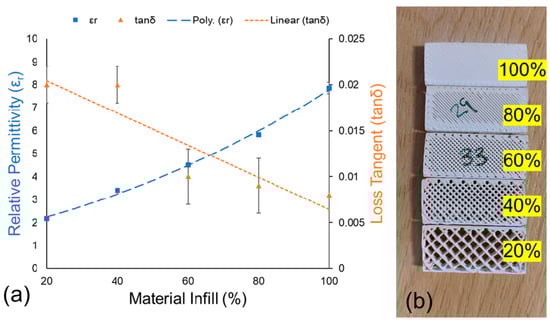 (a) Material Infill (%) vs. relative permittivity (εr) and loss tangent (tanδ), (b) Examples of built test samples with variable material infill.
