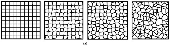 - Sotomayor, O.E.; Tippur, H.V. Role of cell regularity and relative density on elasto-plastic compression response of random honeycombs generated using Voronoi diagrams. Int. J. Solids Struct. 2014, 51, 3776–3786. [Google Scholar] [CrossRef] [Green Version]
