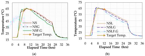 Cement hydration in concrete is an exothermic reaction and causes temperature rise in concrete. This property is responsible for thermal cracking in concrete members and has an influence on shrinkage properties. Generally, there is a relationship between the extent of rise in temperature on the type and content of cementitious materials in concrete. To establish the general behavior of this concrete property, temperature rise, due to cement hydration in semi-adiabatic condition, was conducted on NS and NSLF.G containing S3000. This also enabled a check of the effect of adding limestone powder and fine gypsum on rise in concrete temperature. The results are shown in Figure 4a,b. The results were, then, used to predict adiabatic temperature rise of concrete using Equation (1). This equation is based on a simple thermal insulation test on the relationship between semi-adiabatic temperature rise and adiabatic temperature rise, proposed from previous research [32].
