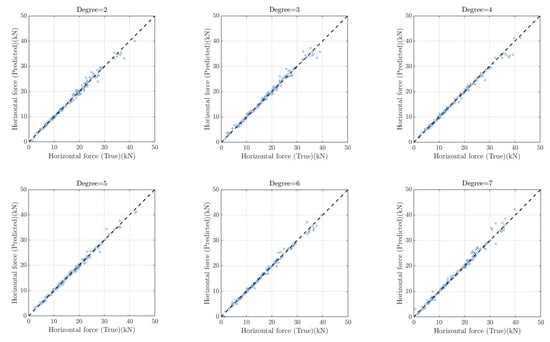Given the available data set, the PCE with different maximum degrees are constructed to investigate the effects of polynomial degrees on prediction accuracy. The predicted wave forces using PCE with degrees varying from 2 to 6 and the true ones in the test data set are compared in Figure 2 and Figure 3, and the variations of R and RMSE with the PCE degrees for horizontal and vertical wave forces prediction are listed in Table 2 and Table 3, respectively. As is seen from Figure 2, the horizontal wave forces can well be predicted by the PCE with a maximum degree of 2, and increasing the maximum degree up to 5 can further improve the prediction accuracy. However, for this particular case, the PCE with a maximum degree higher than 6 does not necessarily result in a better generalization ability, in that more samples might be required to accommodate the dramatically increased number of terms in PCE. This argument is also verified from the results of assessment metrics (R and RMSE) shown in Table 2, where the R of PCE with degree 7 (R = 0.9855) is even smaller than that with degree 2 (R = 0.9943) and the RMSE of PCE with degree 7 is the largest among the investigated degrees. Although the performance of PCE for vertical wave forces prediction is slightly worse than that for horizontal wave forces prediction, as shown in Figure 3 and Table 3, the overall trend of the prediction accuracy variation is similar to that observed in Figure 2 and Table 2, except that the optimal PCE degree is 6 for vertical forces prediction.