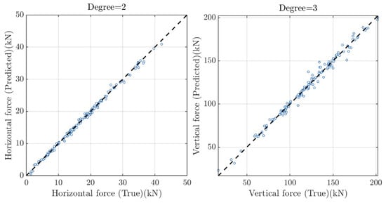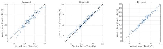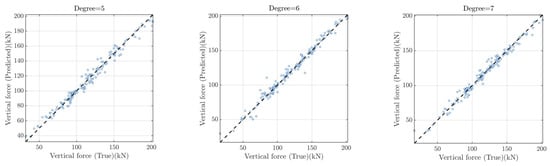 Correlation between the predicted vertical wave forces using PCE with different degrees and the true ones in the test data set.