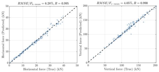 Correlation between the predicted wave forces using the proposed hybrid surrogate model and the true ones in the test data set.