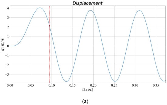 If the velocity of the moving load is less than , the maximum value attained by the transverse displacement occurs when the load is still on the bridge’s span. Otherwise, occurs in the free vibration regime, i.e., after the moving load has left the span. Some numerical results are given in Figure 3 below for the model bridge used in the experiment (Figure 1). Note that the vertical red line delineates the two phases of vibration, i.e., when the load is traversing the beam’s span and when it has left it. Specifically, the value of the moving load is , and the displacement is evaluated at the center of the span for three values of velocity, namely , and . We observe that the maximum transverse displacement of occurs for the subcritical velocity, while for the other two cases, this value drops to and , respectively.