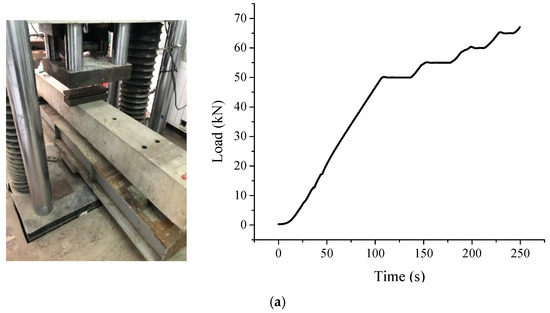 The arrangement for the static load tests of the positive and negative bending moments and the fatigue test is shown in Figure 8. For the positive bending moment, the test load was Fb, and the tests were conducted on two bearers (called PSB1 and PSB2). For the negative bending moment, the test load was Fbn, and the tests were conducted on two bearers (PSB3 and PSB4). For the fatigue test, the test load was Fb, and the test was conducted on one bearer (PSB5).