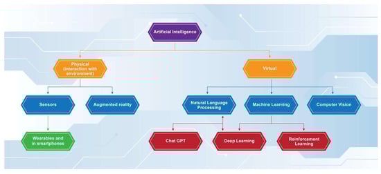 The use of AI in medicine can be divided into two broad categories based on how it functions: virtual and physical []. Physical AI refers to machines that can assist in and perform different tangible tasks, such as surgical operations and the application of robotics in medical interventions. Virtual AI includes all the software that can be used to provide analysis of data, process information, and communicate with other network-connected systems (Figure 1).