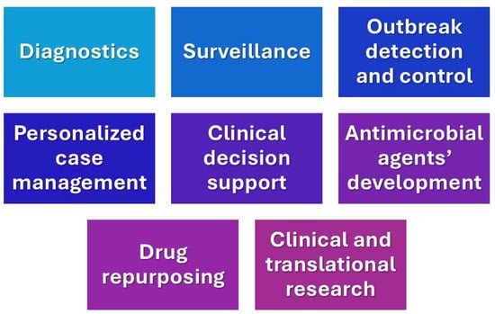 Infectious diseases continue to pose significant challenges to global public health systems, thus revealing various gaps in diagnostics, rapid disease detection, treatment optimization and therapeutic algorithms, outbreak detection and management, and generally, in personalized medicine. In the 21st century, various infections have emerged, leading to pandemics, including severe acute respiratory distress syndrome (SARS), Ebola, Middle East respiratory syndrome (MERS), and Zika viruses []. These infectious diseases are responsible for a great number of premature deaths and increasing the burden of disability worldwide. Infectious diseases caused by transmissible pathogens pose a challenge for clinicians, despite advances in medicine, due to the expanding prevalence of antimicrobial resistance and limitations to the fast and accurate detection of these microorganisms. Biological complexity also poses a great obstacle in understanding and dealing with infectious diseases. AI can play a significant role in extending our knowledge and facilitating our efforts in various areas of infectious diseases [], including laboratory diagnostics, clinical imaging, clinical decision making, surveillance, management outbreaks, and drug discovery (Figure 2).