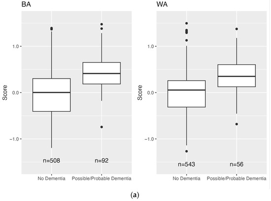 Distribution of scores by dementia status and race (BA: Black American; WA: White American) for Veterans in the Training Sample (n = 5000 in each dementia status group for each race). Dashed lines represent the means of the distribution.