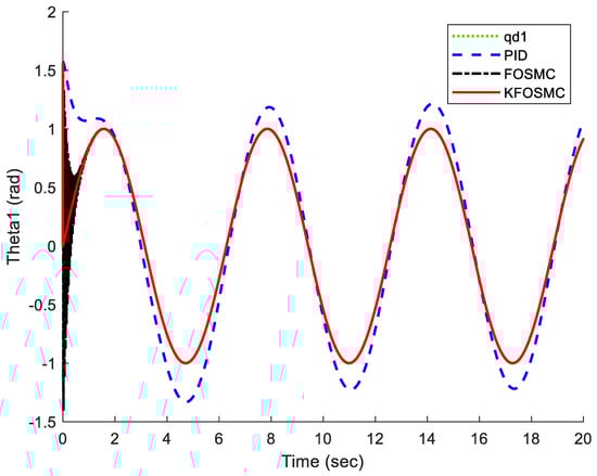 We simulated three controllers to show the performance of the proposed control method. The simulation was conducted in Matlab and using ode 45 order. The time span is [0 20]. The robot’s specifications are and . The PID controller parameters are selected as , and . The FOSMC controller parameters are chosen as , and , with the KFOSMC parameters being the same as FOSMC. These parameters were obtained through the designer experiences and trial–error. The desired trajectory tracking is . The initial conditions of joints are . The linearized Koopman operator is obtained as: