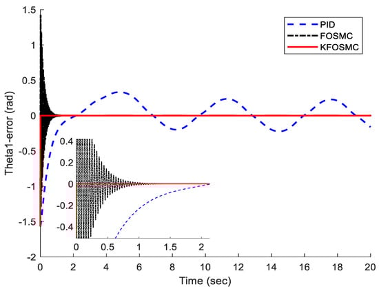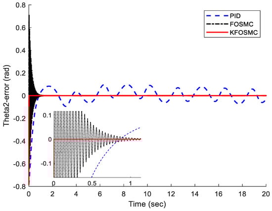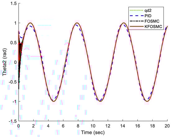 Figure 3 shows the trajectory tracking of joints 1 and 2 under PID, FOSMC, and KFOSMC. It demonstrates that the KFOSMC has better trajectory tracking performance in comparison with PID and FOSMC controllers. The KFOSMC shown with a red line in Figure 3 has high tracking performance that covers the green line completely. Figure 4 shows the trajectory tracking error of joints 1 and 2 under PID, FOSMC, and KFOSMC controllers. For example, the tracking error in joint 1 at a time of 4 s under PID controller is around 0.5 but, under KFOSMC, is equal to zero. Moreover, for that joint, FOSMC creates oscillation but, by applying KFOSMC, there are no tracking errors. Therefore, the tracking error under KFOSMC is zero in comparison to two other controllers. Figure 5 shows the velocity of joints 1 and 2 under PID, FOSMC, and KFOSMC controllers. Figure 6 shows the control signals under PID, FOSMC, and KFOSMC controllers. The control signals using KFOSMC reduced significantly in comparison with two other controllers.