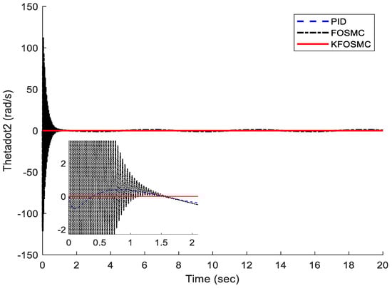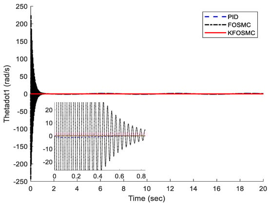 Velocity of each joint under PID, FOSMC, and KFOSMC controllers.