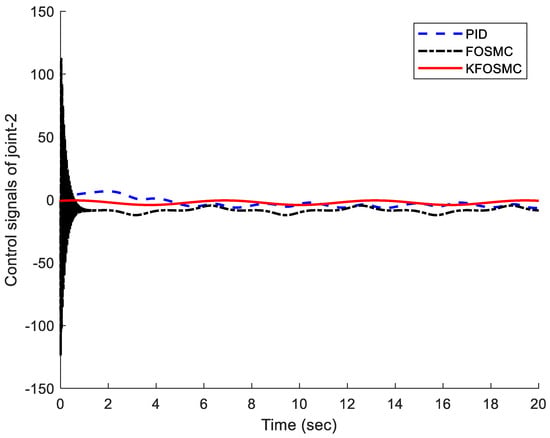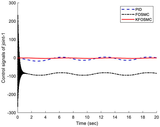 Control signals under PID, FOSMC, and KFOSMC controllers.