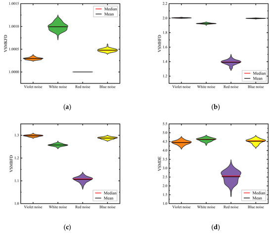 From Figure 6, the situation with is similar to that with ; all six nonlinear dynamic metrics can distinctly differentiate red noise from the other three noise types; in the case of the VSMKFD, violet noise and blue noise overlap only slightly. Conversely, for the other five metrics, there is a noticeable overlap among the violet, white, and blue noise, with the most significant overlap continuing to be in the VSMDE. In summary, the VSMKFD demonstrates superior capability in differentiating noisy signals, further attesting to its efficacy.
