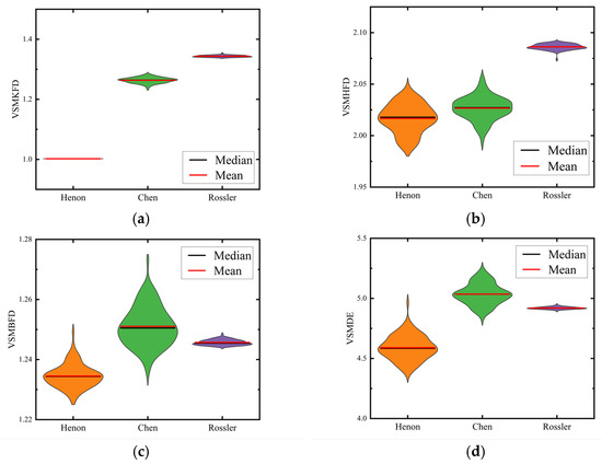Figure 8 and Figure 9 show the feature distribution of six metrics for chaotic signals. As before, we present only the scenarios of and . It can be observed from Figure 8 and Figure 9, that whether or , there is no overlapping distribution area in the VSMKFD, and the means of three chaotic signals also differ greatly, which indicates that the three kinds of chaotic signals can be distinguished; all three chaotic signals produce a large area of overlap in the distribution map of the VSMHFD; neither the VSMBFD nor the VSMDE can fully distinguish between the three chaotic signals; both the VSMPE and the VSMLZC can only distinguish the Rossler signal, while the distributions of Henon and Chen signals have large overlaps. With the above analysis, we can see that the VSMKFD has better classification performance on chaotic signals.