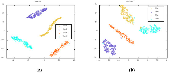 Then, to more intuitively demonstrate the advantages of the VSMKFD in distinguishing SRN, we calculate the different nonlinear dynamic metric values of each signal under 10 scales to obtain the corresponding 10-dimensional spatial feature set. Then the t-stochastic neighbor embedding (t-SNE) was visualized to map each 10-dimensional object onto a point in 2-dimensional phase space to visualize the extracted features. Figure 11 depicts the visualization results of extracted features of four ship signals. From Figure 11, it can be seen that the VSMKFD has the best visualization result; the features of the various kinds of SRN in the VSMKFD are relatively centralized and have nearly no overlapping sections. However, the features extracted from the other nonlinear dynamic metrics suffer from varying degrees of overlap and decentralization. For example, the features of each SRN in the VSMHFD are more decentralized than those of VSMKFD, especially in the distribution of Ship-1, Ship-2, and Ship-4. For the VSMBFD, VSMDE, VSMPE, and VSMLZC, Ship-1 and Ship-4 have wide overlapped areas. In addition, the distribution of Ship-3 in VSMLZC was more decentralized, being split into two parts. Therefore, the proposed VSMKFD can better recognize different categories of SRN compared to other nonlinear dynamic metrics.