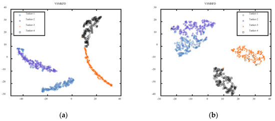 Aiming to further verify the efficiency of the proposed VSMKFD, we conducted a feature extraction experiment for four tanker signals, and the visualization results of the extracted features of four tanker signals are shown in Figure 13. From Figure 13, it is evident that the distribution of four signals in the VSMKFD can be nicely separated with scarcely any overlap of features. In contrast, the other five metrics all suffer from varying degrees of feature overlap. Neither the VSMHFD nor the VSMBFD can distinguish between Tanker-1 and Tanker-2 due to overlapping features; VSMDE cannot even distinguish between Tanker-3 and Tanker-4; the most serious are VSMPE and VSMLZC, where all four signals have overlapping features. The t-SNE experiment shows that the VSMKFD is more effective for the SRN recognition task than other nonlinear dynamic metrics.