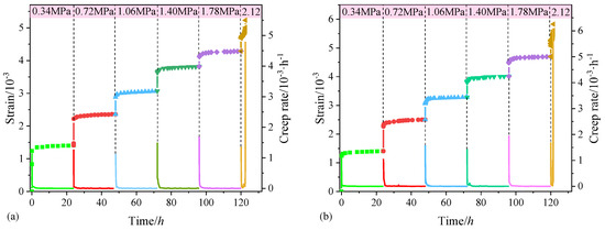 Taking the creep shear test of carbonaceous shale under the normal stress of 0.6 MPa as an example, some test curves are shown in Figure 4. From Figure 4, it can be seen that under low shear stress, the specimens exhibit both deceleration creep and steady-state creep. Under destructive shear stress, the specimen enters the accelerated creep stage after a period of steady-state creep, with a sharp increase in creep rate, and eventually experiences rapid failure along the shear plane. This indicates that the damage to the specimen has reached its limit, which is consistent with the phenomenon of sudden instability and failure of high slopes with carbonaceous-shale weak interlayers after long-term creep deformation [42,43].