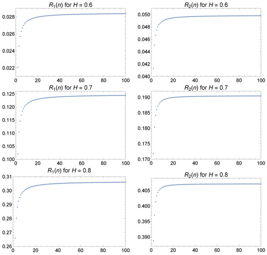 We numerically study the behavior of the norms and . Figure 13 illustrates their behavior as functions of n. It is observed that both norms increase with increasing n or H. Additionally, as , and approach certain limits that depend on H and can be calculated numerically.