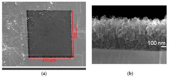 The second material we considered is nanoporous carbon. It was grown using an original approach involving the deposition of copper/carbon nanocomposite film followed by selective etching of copper in nitric acid allowing obtaining a nanoporous skeleton of carbon. As shown in Figure 5a,b, this material was successfully synthesized over the active layer made of silicon. The transistor was neither destroyed during the deposition of the copper/carbon film nor during the selective etching of copper using nitric acid. As shown Figure 5c, the transfer characteristic of the device is modified after the nanocarbon integration but maintains, however, a reasonable electrical characteristic sufficient for sensing applications.