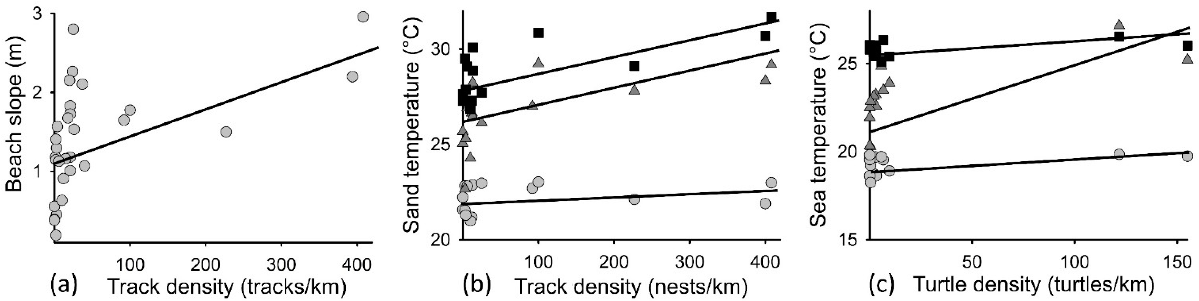 3.2. Inwater Turtle and Beach Track Densities Related to Temperature and Beach Slope