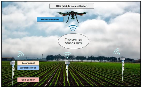 A related emerging technology is the use of UAVs in smart agriculture. This has been referred to by some as a new type of transformation in the agricultural industry []. Compared to other types of remote data collection, UAVs offer a wider range of versatility and flexibility. They do not require scheduling to be planned as far in advance as other aircraft or satellites and can fly reliably at low altitudes and low speeds with the ability to acquire spatial and temporal data []. A previous survey of the literature stated that UAVs will not only play an important role in the Internet of Things (IoT) vision but may even become the main key enabler of that vision. Drones are particularly useful for data collection, not just in agriculture but also across broader areas such as vegetation science, environmental monitoring, forestry, remote sensing, and water area detection []. Other uses of drones in precision farming and the agricultural supply chain include farm analysis, integration with cameras, and GIS mapping []. In addition, drones can even be used to deploy a wide range of resources to a field, such as water, fertilizers, and pesticide []. In most cases, sensors are deployed at difficult-to-reach locations. Sometimes, these locations include hilly areas and large farms where nature hurdles, such as trees, small mountains, or unexpected slopes, cause signal distortion. In such cases, it is difficult to gather data. However, the use of UAVs in such areas can reduce the cost and increase the efficiency of data collection [,].